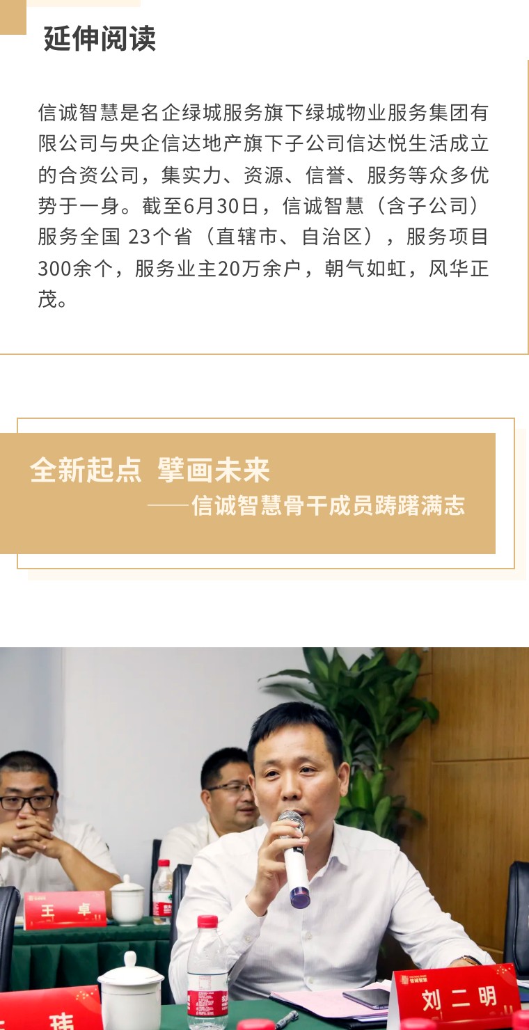 秉承“以提供业主幸福生活、资产增值为己任,以人文服务、智慧服务、不动产综合服务领跑,打造可持续发展的现代化运营服务企业”定位,信诚智慧站在新起点上,奋力迈向新征程。绿城服务有关领导,对信诚智慧寄予厚望,希望信诚智慧积极发挥自身物业专业优势,形成发展特色,迅速成长。